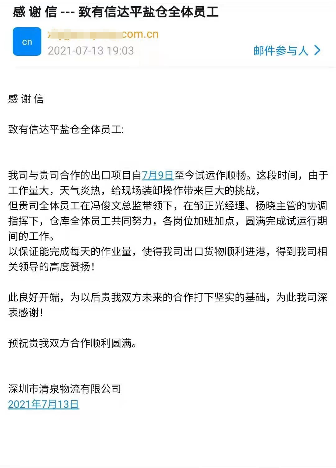 有信达与深圳市清泉物流有限公司于7月9日开始项目试运行,有信达小伙伴们秉持着企业使命为客户尽心尽力服务,高效完成作业,为合作伙伴解决难题!感谢合作伙伴的认可与肯定!同时预祝与清泉物流公司合作顺利圆满!
