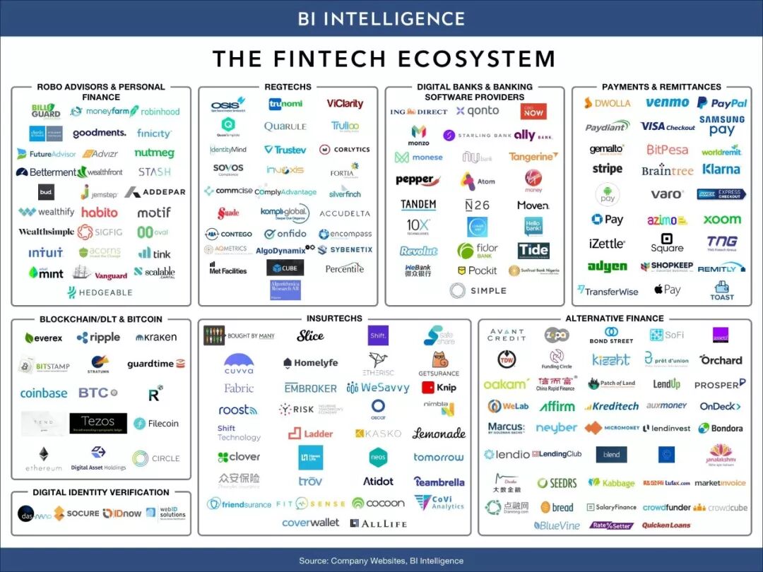 总结得来说,Fintech就是使用软件和技术提供金融服务的公司,包括金融咨询和财产管理、在线贷款、在线银行、移动支付、在线汇款等。