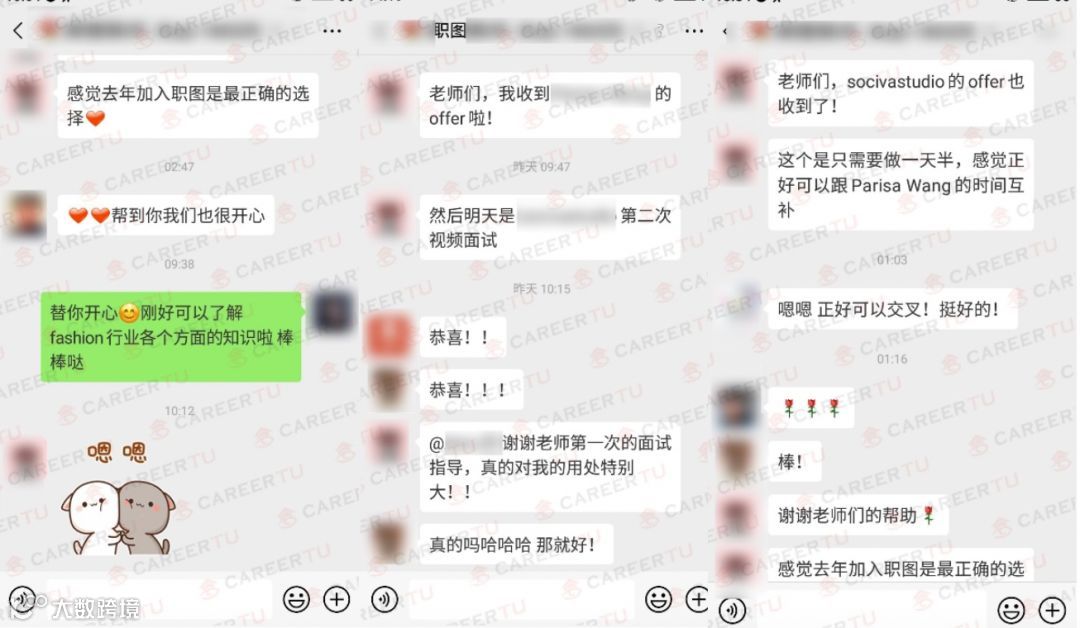 在职图金牌导师一对一模拟面试辅导课之后,R同学的面试技巧也有了质的飞跃。最终成功斩获两家Fashion行业公司的实习Offer!正如R同学所说,这两家公司分别是甲方乙方,可以让R同学从不同角度来了解Fashion领域,也为R同学今后找Fashion行业的全职工作打下了坚实的基础。