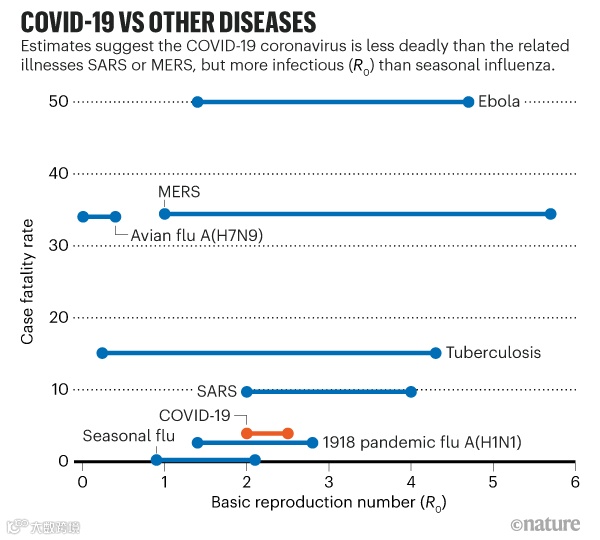 新冠肺炎(红色)与其他疾病(蓝色,从上到下分别为:埃博拉、MERS、H7N9禽流感、肺结核、SARS、1918年H1N1流感、季节性流感)R0值和致死率的对比。目前对新冠肺炎病死率的估计表明,新冠病毒的致死率低于其他大规模疫情的病原体,如SARS、MERS和埃博拉。但是这种感染似乎比季节性流感等其他疾病更容易传播。新冠病毒的基本繁殖数R0值约2到2.5。(图片来自The coronavirus pandemic in five powerful charts,Nature,2020-03-18)