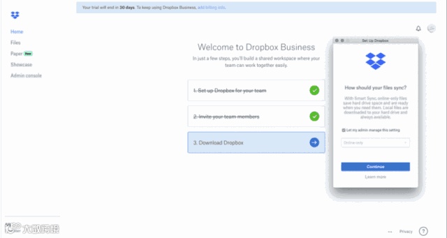 Dropbox的Onboarding用户引导流程真的做得很好。第一次登入后,马上出现可爱的插画Illustration亲切地欢迎使用者的到来。再来,利用放大镜的焦点,将使用者的目光聚集在关键功能,并用大幅的画面下栏说明档案存取及共用文件Paper,让人不忽略也难,十分简洁、易懂、美丽的设计。而UIUX设计师,要考虑到从视觉到用户登录中的每一个步骤和细节。
