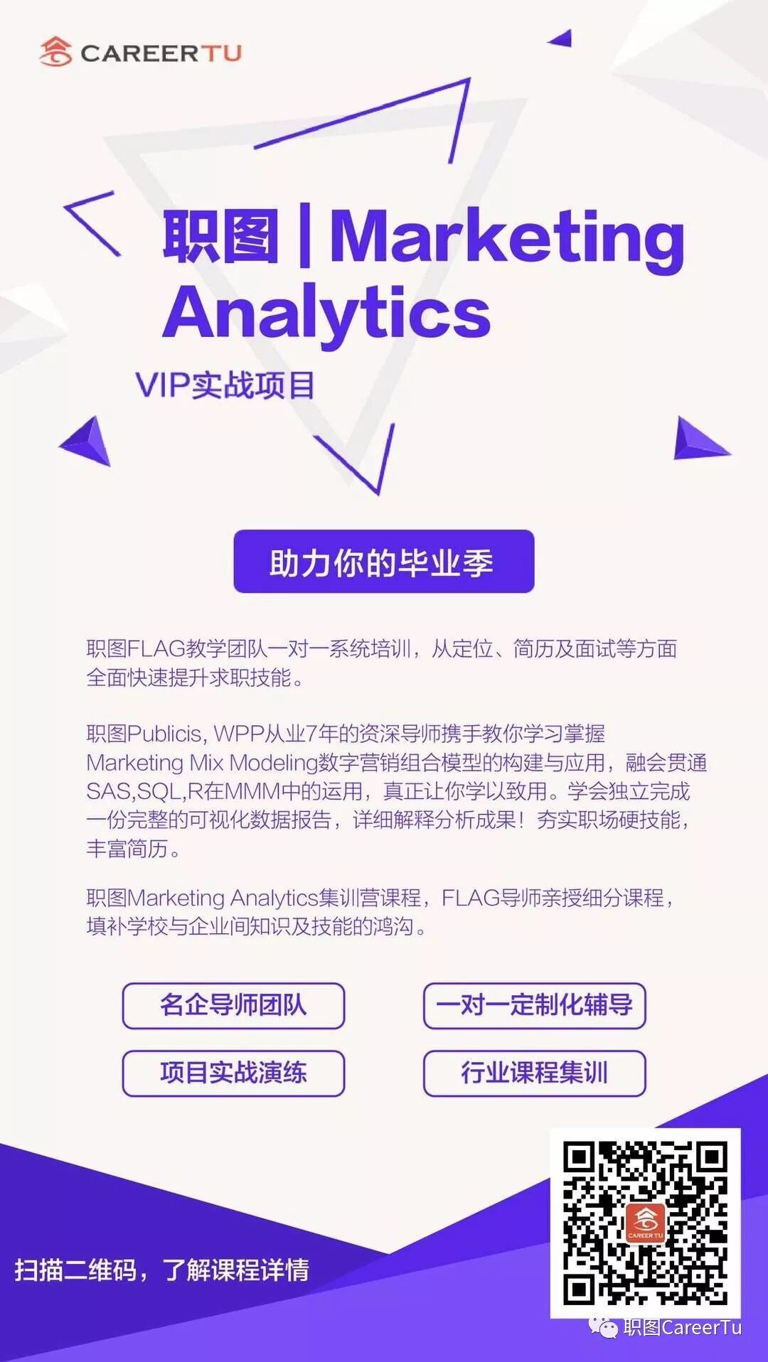 J导师在四大Media Agency Publicis,担任Advanced Analytics部门的Associate Director,主要项目以市场营销组合模型(Marketing Mix Modeling) 以及数字营销模型(Digital Attribution Modeling)为主,有7年以上市场管理咨询,媒体投放,数字营销和市场营销组合模型方面的丰富经验。