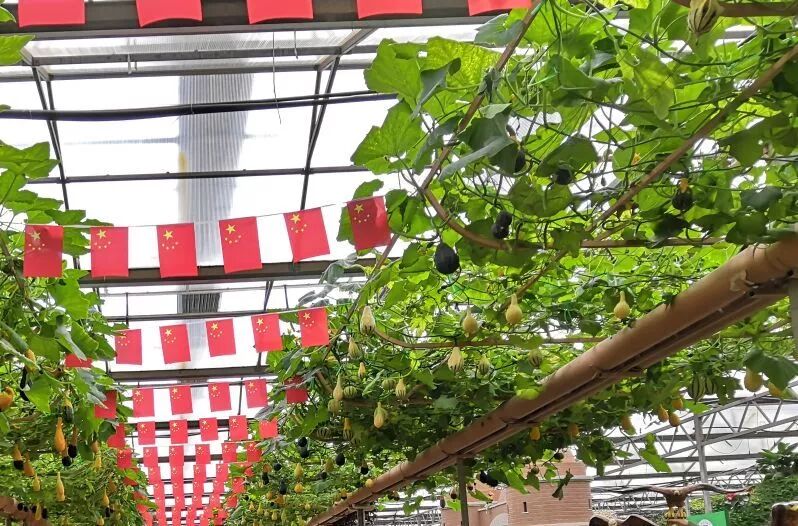 这里有长在空中的番茄、茄子、小南瓜、瓢葫芦,挂在空中大棚上绿意满满,既节省了地面空间、又增加了观赏价值。