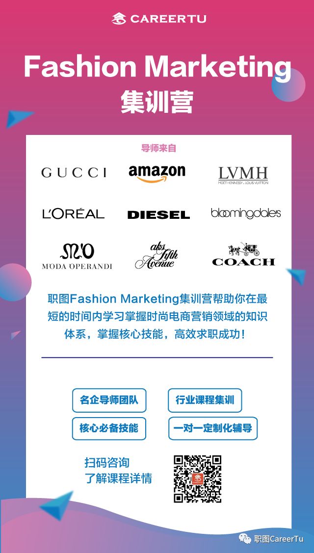 【职图Fashion Marketing集训营】能够帮助你在最短的时间内同时了解中国和美国时尚营销领域的知识体系,掌握核心技能,并且能很快运用到实际案例中。