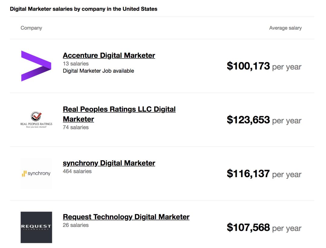 Digital Marketing的起薪在60K左右,未来的发展也有很多不同的可能性。除了继续在Digital Marketing 方向向上晋升,职位从Associate 到 Manager, Director, VP 一路上升到最后的Chief Marketing Officer (CMO) ,也有很多先例,从Digital Marketing转型成为了Growth Marketer,Product Marketing Manager等角色。