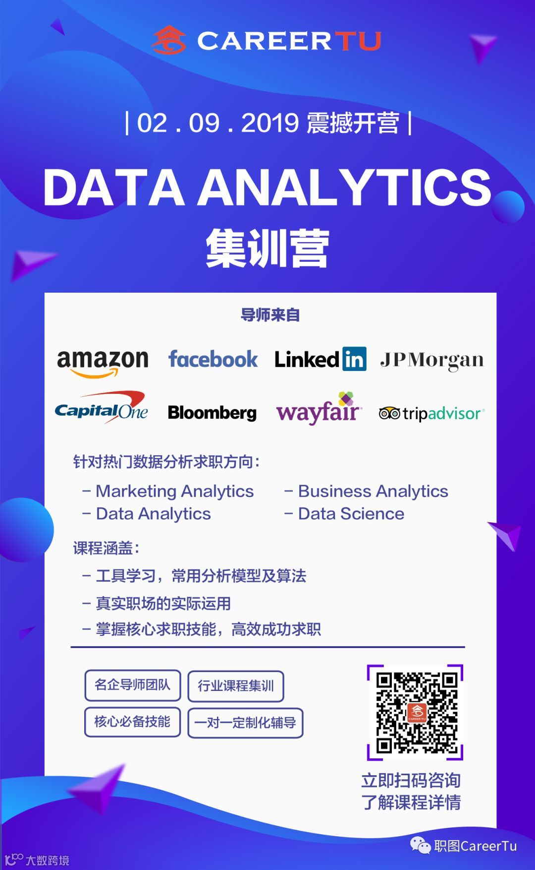 为了让你更加深入地学习Marketing Analytics,Data Analytics,Data Science三个方向,职图特别推出了数据分析集训营,2019年2月9日将震撼开营!