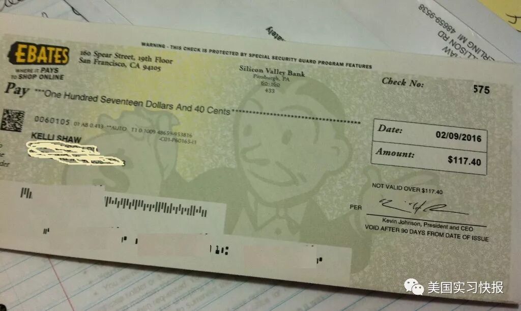 每次购物成功以后,你就会在绿色小条上看见你获得了多少Cash Back。Ebates 还是一个非常良心的公司,Ebates每三个月会寄出一次支票,无论是1刀或者1000刀,或者也可以选择PayPal提现。