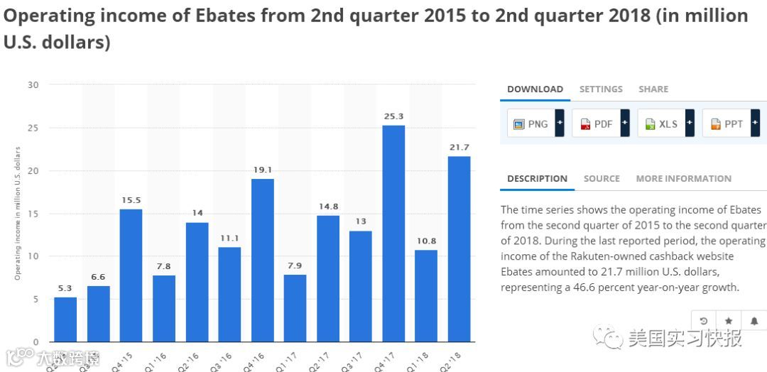 根据Ebates 2018年公布数据,目前拥有超过1亿用户数,每日独立访客超过500万。2018年2季度收入高达 $2170万,随着电商行业的普及化,Ebates 市场也在不断扩大,市值不断刷新。