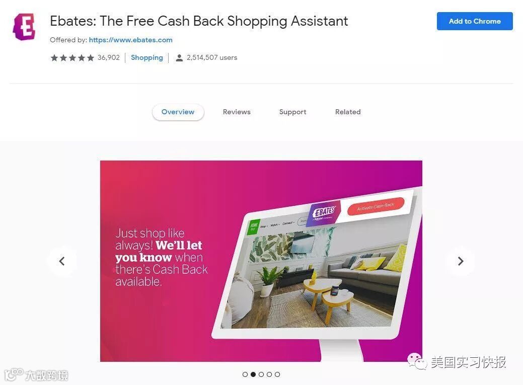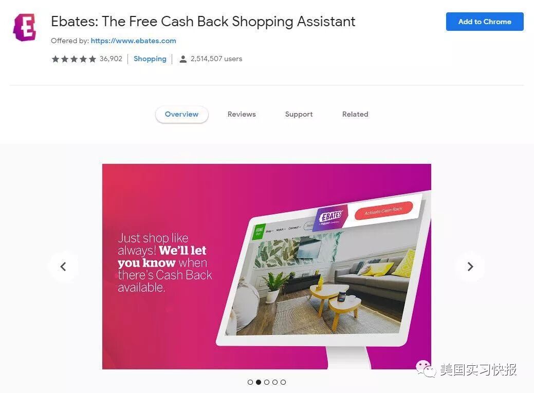 安装这个插件的好处就是,每次你访问一个Ebates合作伙伴的网站时,页面顶部都会出现一个绿色的小条,向你展示会赚多少现金,当你购物时,你会自动收到现金或者折扣券。