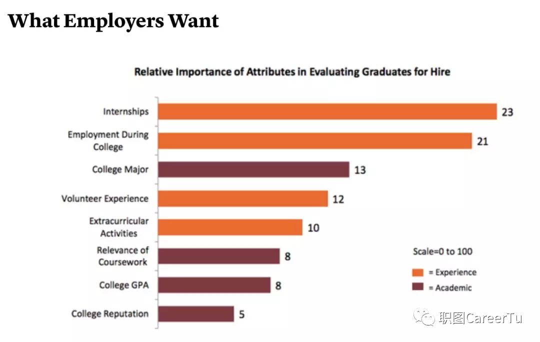 美国知名高校杂志Chronicle of Higher Education不久前针对美国企业雇主的调查结果显示,“大学GPA”、“大学名牌”这些因素都被排在最末。