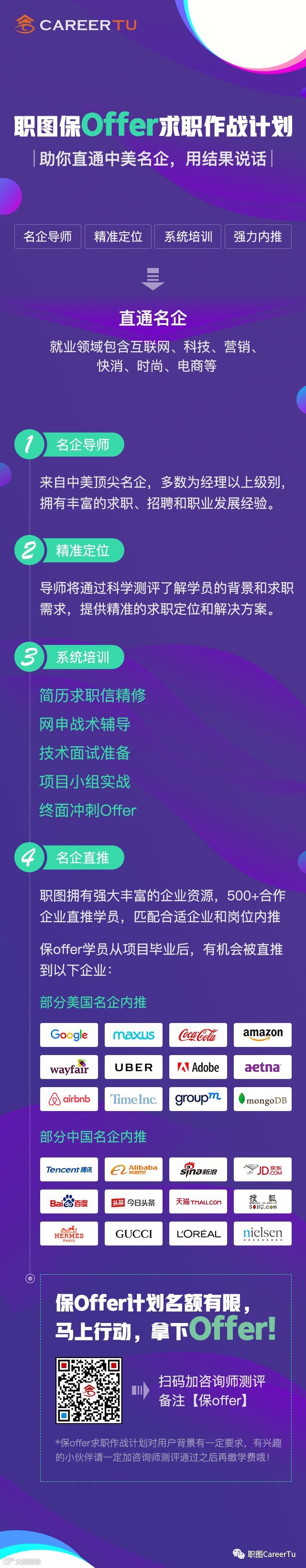过去6年中,职图帮助6000+同学拿下了中美名企的实习和工作Offer,也希望帮助更多的同学实现自己的职业理想。
