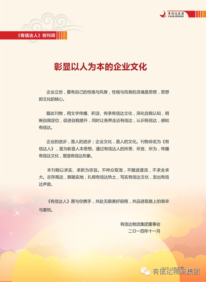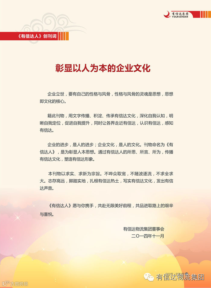 “给你剪刀,快拆开看看吧”同事热情地凑上来。一拆开,火红的封面上总裁的照片、公司的LOGO、还有“有信达人”立即映入眼帘,莫名地让人觉得温暖、激动。给同事们分发完,大家都迫不及待地翻看起来,都说我们总算等到了,刊物真不错。