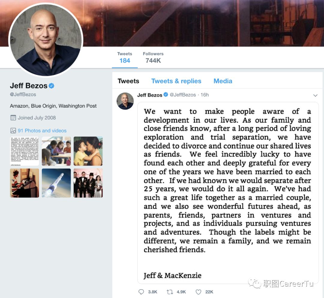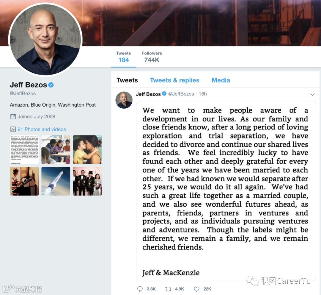 就在亚马逊首次成为全球市值最高的公司之后,Jeff Bezos(亚马逊创始人)宣布,决定和结发之妻MacKenzie Bezos 离婚。