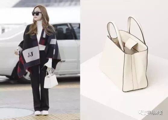 郑秀妍手上这款Triennale也挺好,本来纯白色可能会显得过于“白富美”,但适当加入黑色的勾边,则让包包增添了几分利落感。