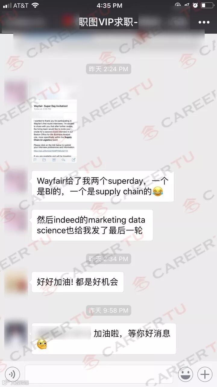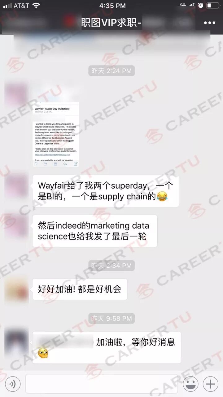 职图Data Analytics VIP冲刺实战项目学员N,就同时收到了来自于Wayfair和Indeed两家公司的面试邀请,分别是Business Analyst和Marketing Data Scientist. 在职图教学组和导师的悉心指导之后,成功打败诸多竞争者,走到了最后一轮的终面!我们期待她的好消息。