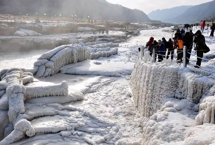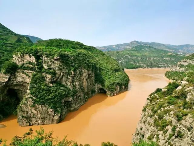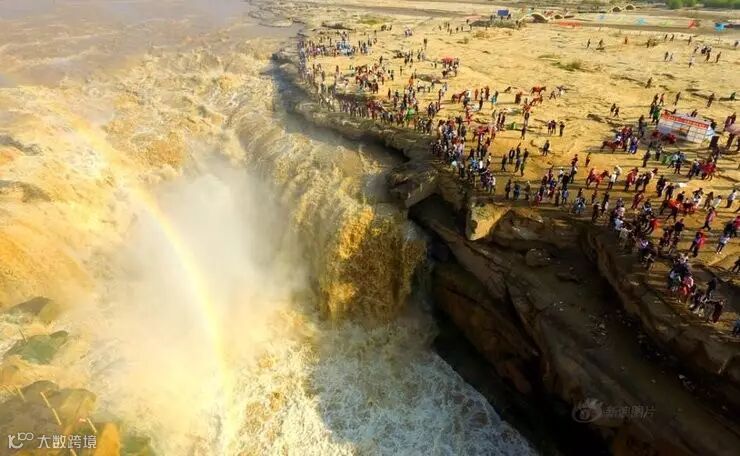 黄河水一路咆哮至秦晋峡谷时,河面宽度由400多米骤然收缩为50米,倾泻于落差30米的石槽中,夏季和冬季最漂亮。