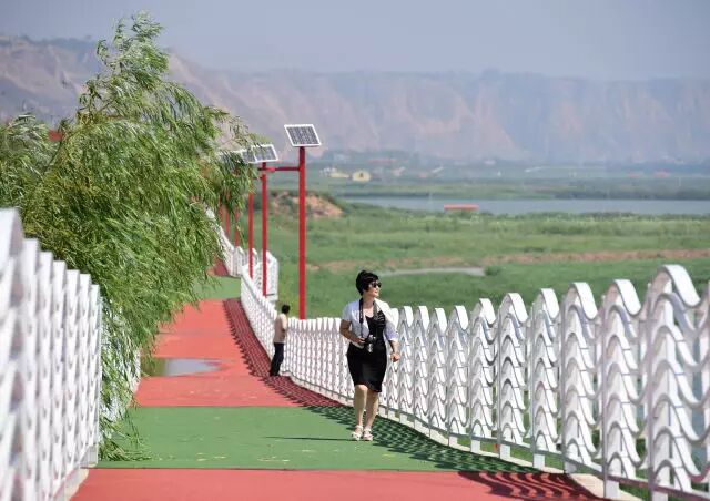 △8月8日,游客在沿黄观光路渭南段一处步道上游览