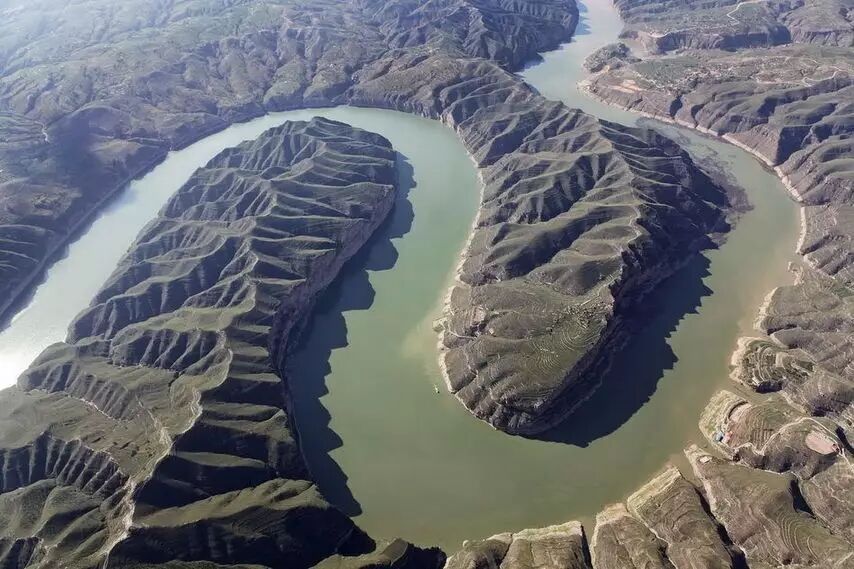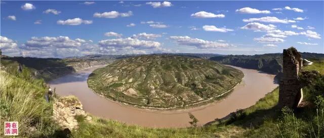 浑黄如浆的黄河以磅礴之势流入清涧,大自然的鬼斧神工使得黄河在这里转了一个360度的大弯,形成远近闻名的太极湾。