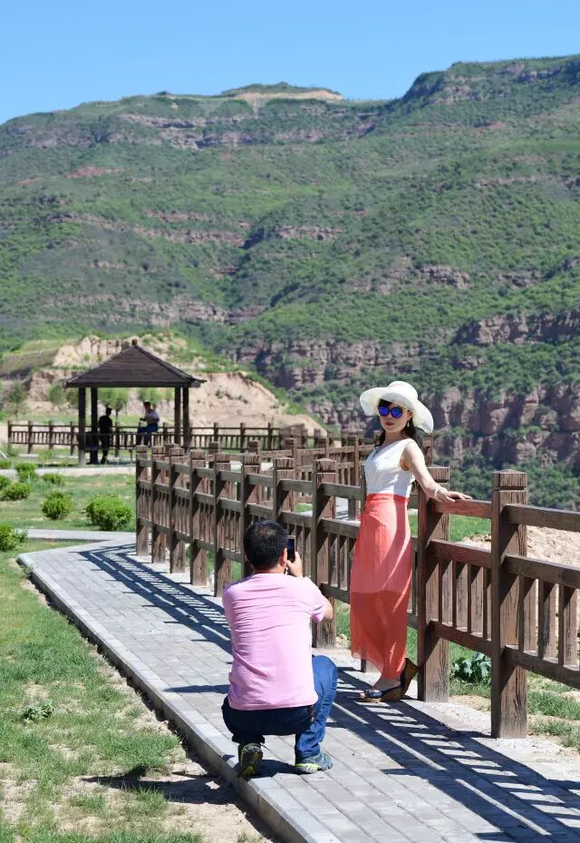 △8月9日,游客在沿黄观光路延安段舌头岭服务区内拍照。
