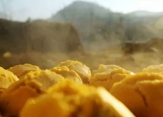 米黄是用黄米磨成细粉后发酵成糊,再用特制的小砂锅烙熟,香气扑鼻,色泽金黄,半月形的外形讨人喜爱;