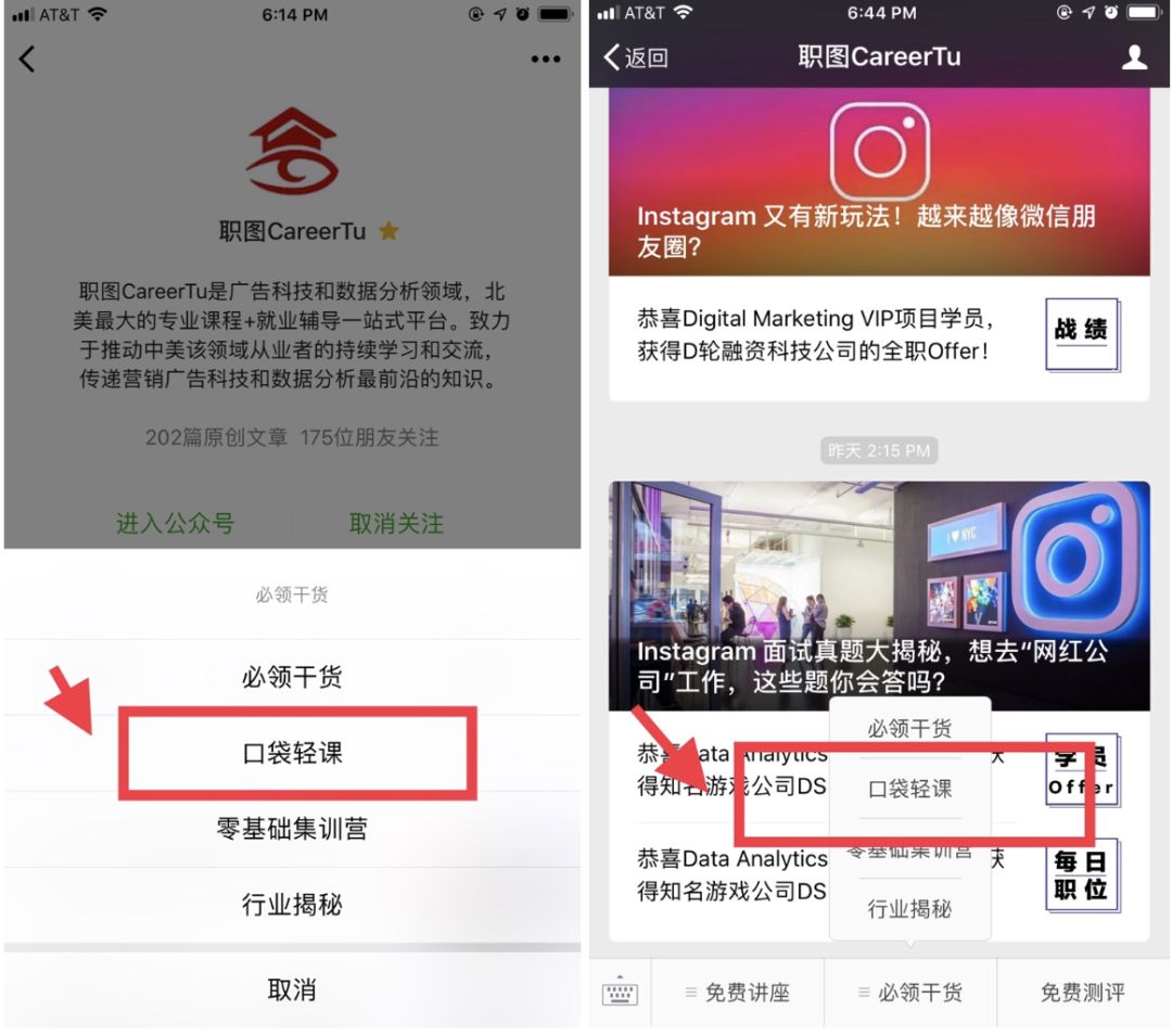 点开微信菜单中的“必领干货”,点击口袋轻课,你就会看到职图口袋轻课最新课程了!