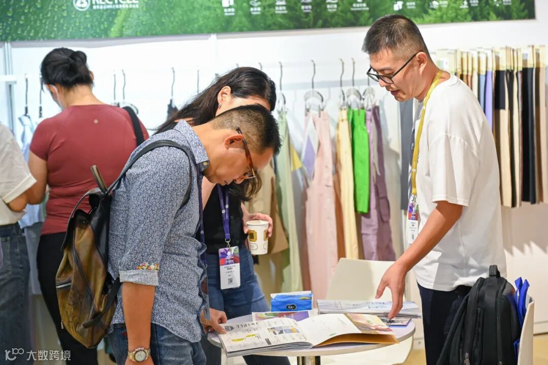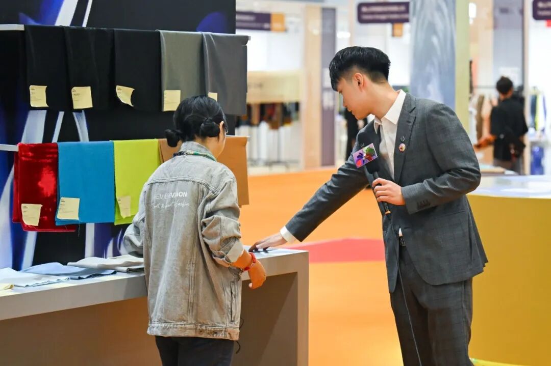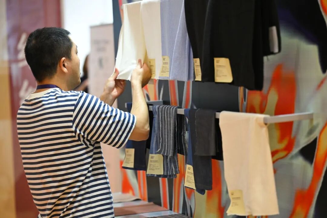 现场集结近50家通过PV体系审核的欧美和亚洲领先材料公司,开展首日吸引不少国内外商业品牌、独立设计师、高奢电商、定制工作室等研发导向的时装品牌。接待、洽谈、介绍新品,精彩之处应接不暇,如火如荼,浓烈的商贸氛围下迸发市场生机,行业参与者在秋日丰收节庆里共探中国时尚产业在循环经济下的全新机遇。