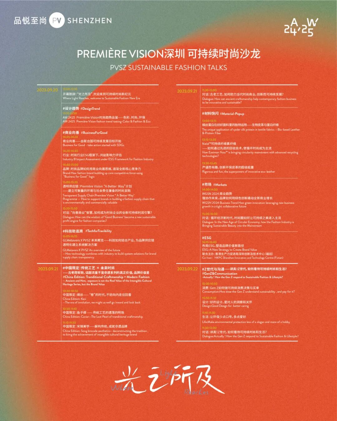 AW24-25 PV深圳可持续时尚沙龙,以“光之所及”(Where Light Reaches)”为主题 ,揭示在全球可持续发展的大势与共同目标下,中国可持续时尚冉冉而生。其中政府、企业、消费者3大主体版块酝酿的可持续前瞻性力量,犹如光线,由弥散到聚合,由隐约至明晰,由量变到质变引领中国可持续时尚进程。光,亦如一股太阳般的能量,温暖慷慨,赋能新生。