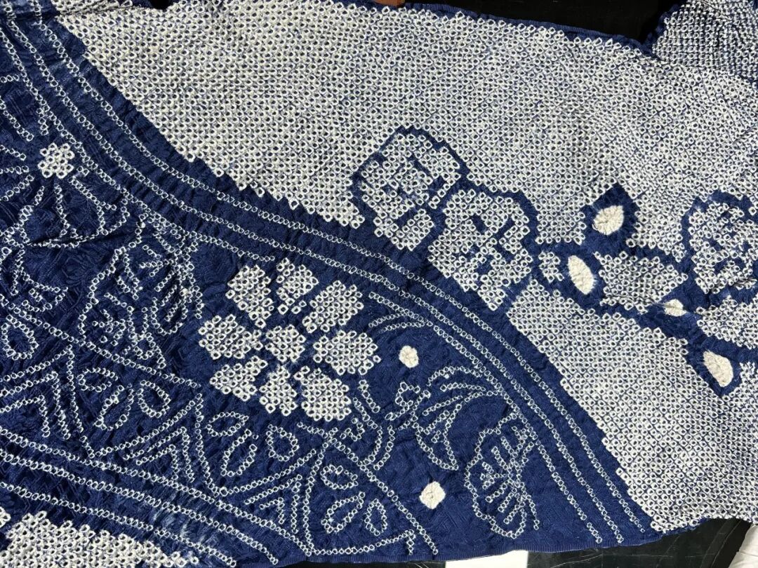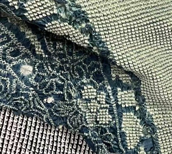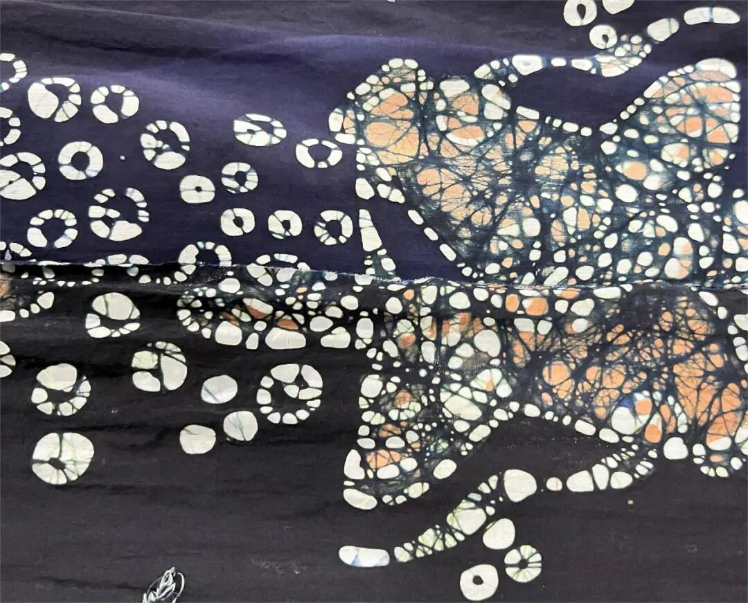 精美的植物染面料采用蜡缬染色工艺,图案饰以迷人的小花。蓝染赋予面料深邃的蓝色,而蜡缬工艺则为其增添了独特的纹理和层次感,而小花的设计增添了独特的艺术韵味。