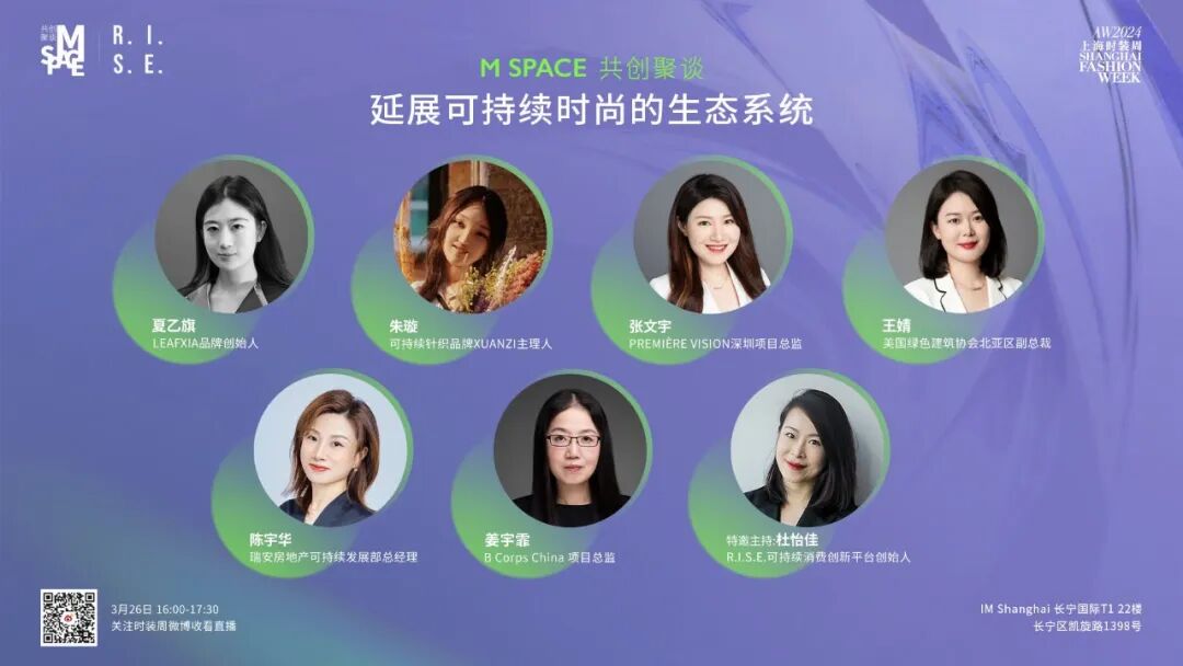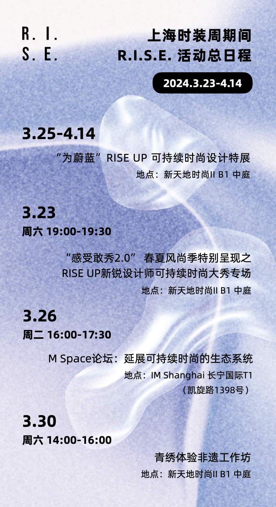 3月26日 16:00-17:30,R.I.S.E.可持续消费创新平台将在2024秋冬上海时装周M Space共创聚谈上,与来自时尚行业的学界专家、设计师、地产、非营利机构等共同致力可持续时尚的伙伴,呈现一个在本土发生着的可持续时尚生态系统,共同探讨引导更多人参与以时尚为核心的消费生态向可持续发展转型的有效路径。