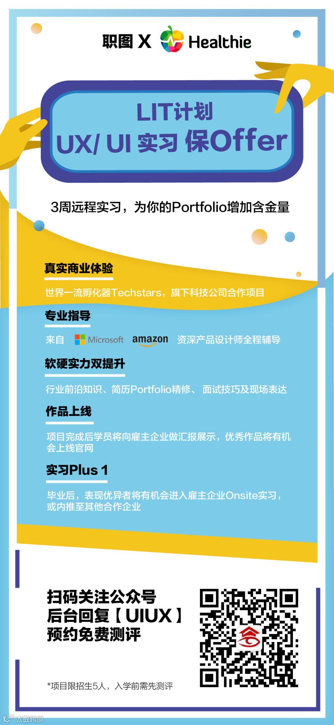 但是留给我们留学生求职、找实习的时间特别少,因此如果要想在短时间内提升自己的产品设计能力,获得实习机会,同来自Microsoft、Amazon的一流产品设计师学习,可以报名参加职图和科技公司Healthie合作的远程实习保Offer项目。 (扫码回复可以参加免费试听课,及项目免费测评预约链接)