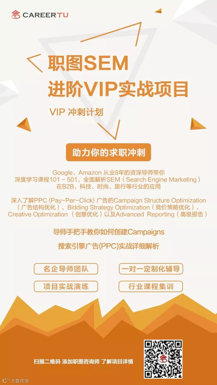 职图CareerTu推出的SEM 进阶VIP实战项目,让来自Google资深广告产品经理,Amazon资深数字营销经理,MongoDB资深数字营销经理共同教导大家如何用Google AdWords来进行有策略的付费搜索广告,包含Text Ads 和Shopping Ads,并且手把手带你做实战项目,让你拥有一份高质量的求职敲门砖。