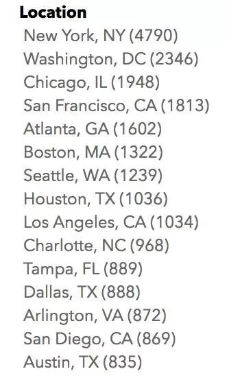 我不会告诉你,像Data Analyst(数据分析师),Web Analytics(网站分析师)这样的工作,我所在的城市职位数量是零,即便是Title(职位名称)类似的,职位描述也和你设想的不太一样。但是看看大城市, 就Data analyst(数据分析师)为例,纽约的Open position(开放职位)就有4700+,DC 有2000+,Chicago有近2000