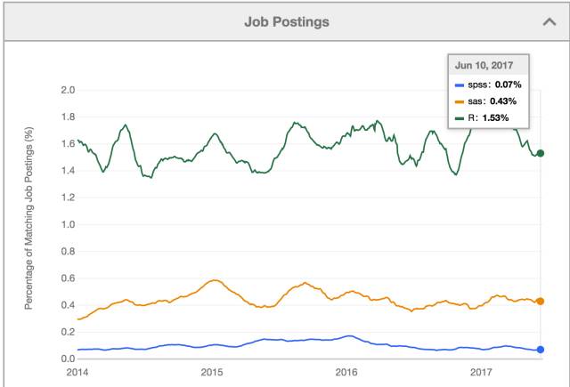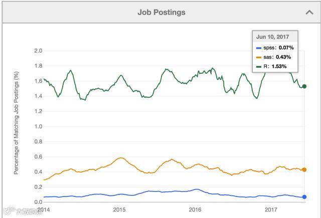 先说课程设置,很多学校的课程是滞后于市场环境的,无论大农村还是城市里的学校都存在这种情况。我学了两个学期的SPSS,后来才发现很多公司已经不用这个软件了。大家可以看看下面这张图,SPSS, SAS, R在业界被使用的趋势。