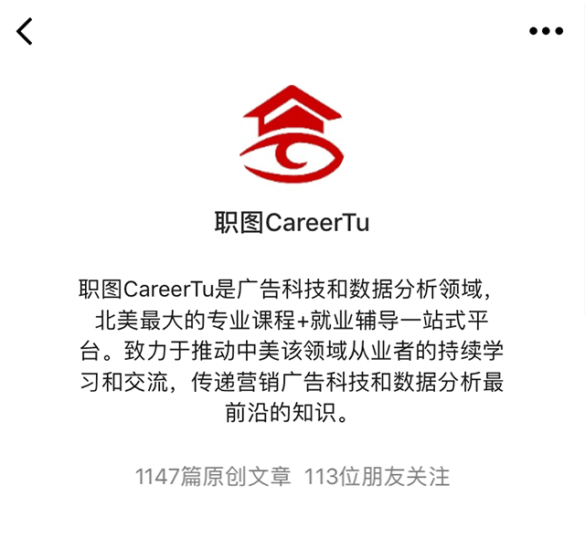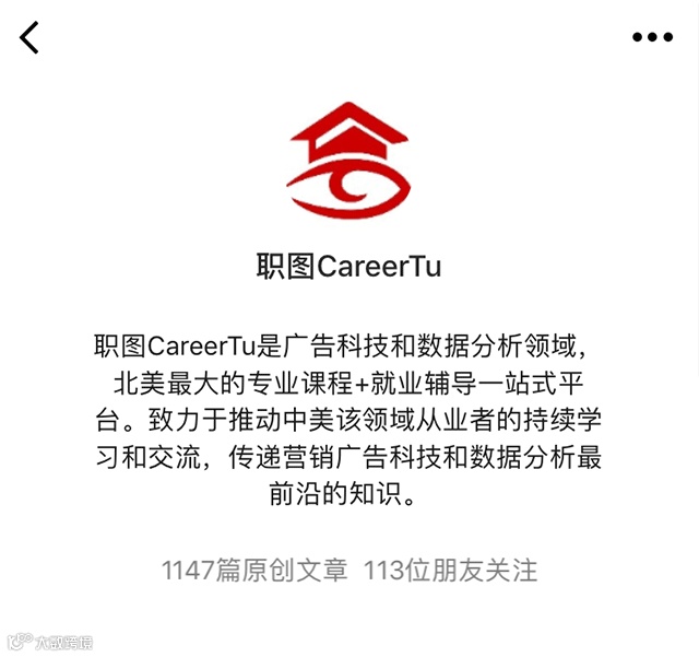 职图是中美最专业的广告科技和数据分析的职业教育平台,扫码关注职图公众号,阅读互联网广告科技行业干货内容,体验来自名企导师的免费课程。