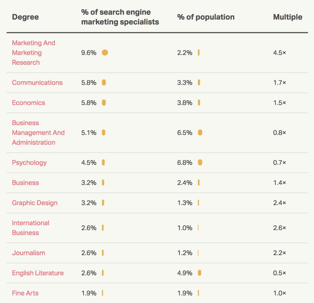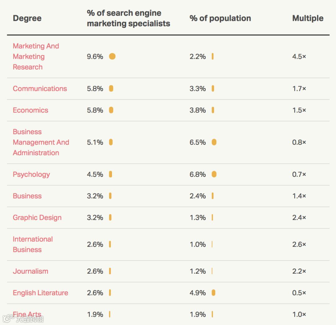 相对于其他行业,Digital Marketing(数字营销) 对专业的限制并不是特别严格。通过下图可以看到,Marketing (营销), Communication(传媒), Economics(经济), Business Management(商业管理)等专业都可以从事SEM。