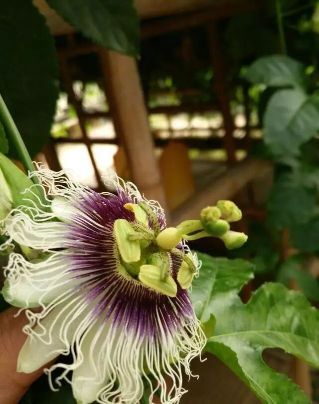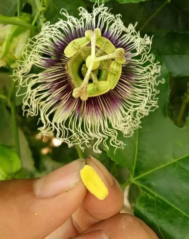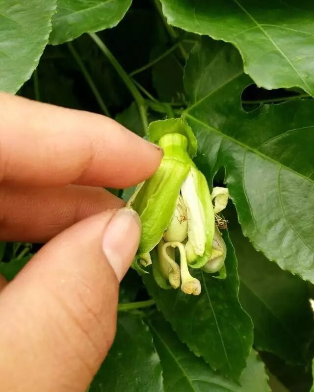 然而现在只需要一个小动作就可以让你种的百香果挂满果实,那到底是什么呢?原来是把百香果的雄蕊掰下来一个,把花粉抹在雌蕊的柱头上,这样就可以确保百香果能百分之百坐果了,另外由于百香果的雄蕊是分别朝向五个方向的同心圆,所以在你摘掉一个花粉以后还能区分这个百香果是不是授粉完成。