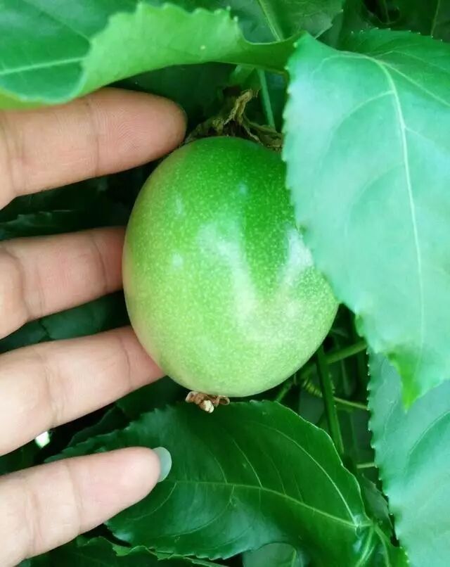 当授粉完成后的额第五天百香果的果实就已经长至花生大小了。从这以后百香果就进入了快速膨果期,这时候就可以明显的看出来一天一个样了。