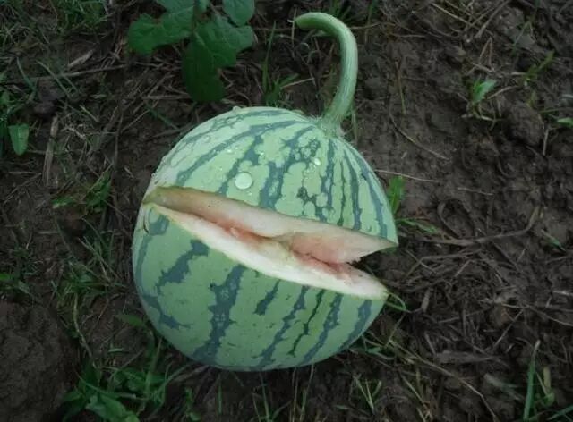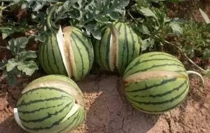 就是西瓜采收前,瓜从花痕外自然开裂。裂瓜多发生在瓜瓤开始变色的所谓泛瓤阶段,这时由于瓜皮的发育缓慢逐渐变硬,而瓜瓤的发育却仍在旺盛阶段,如果再加上久旱遇雨或灌水量忽多忽少,或者在瓜的发育前期肥水不足,而发育后期肥水供应又过多时,都可能发生裂瓜。