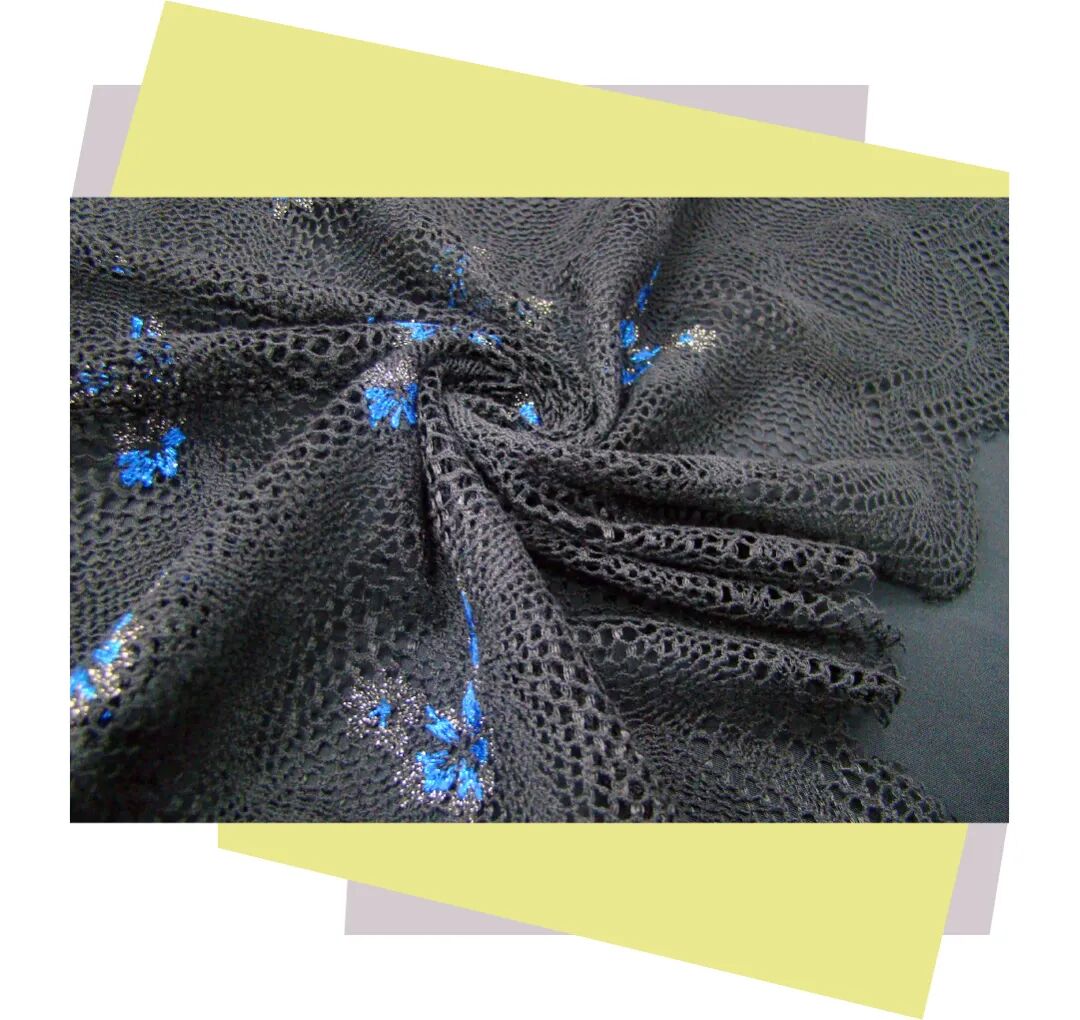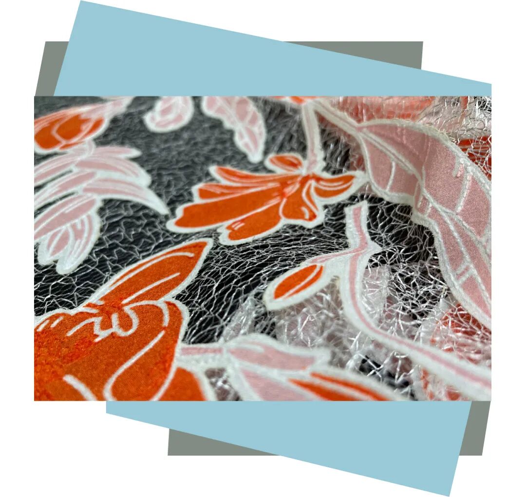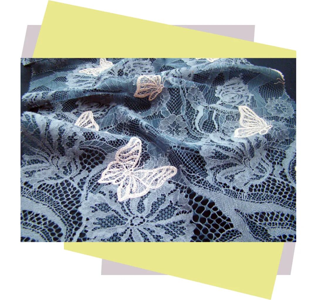 该产品的网底为细腻的细孔网,纱线为低捻纱掀布绣,采用100%聚脂纤维为原料。其整体的花型栩栩如生,水溶部分既立体感强,又手感柔软。设计上,通过蕾丝和镂空的结合,使之飘逸且富有质感,厚薄适中,可用于春秋长裙。而在清洗时,需隔布低温蒸汽烫,温度在80-110度左右,套袋机洗,严防勾丝、爆晒。