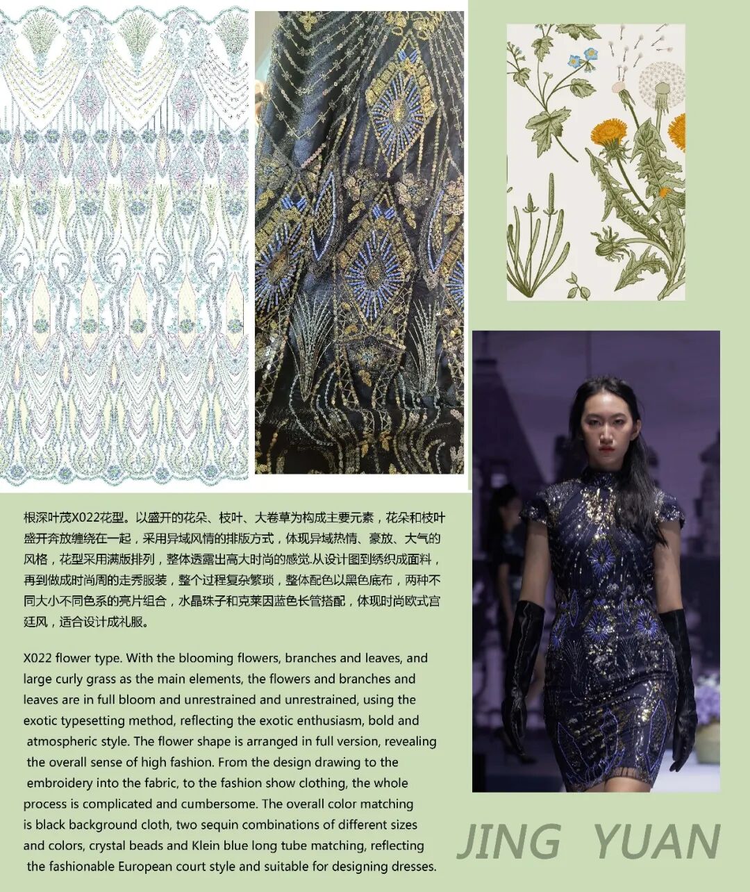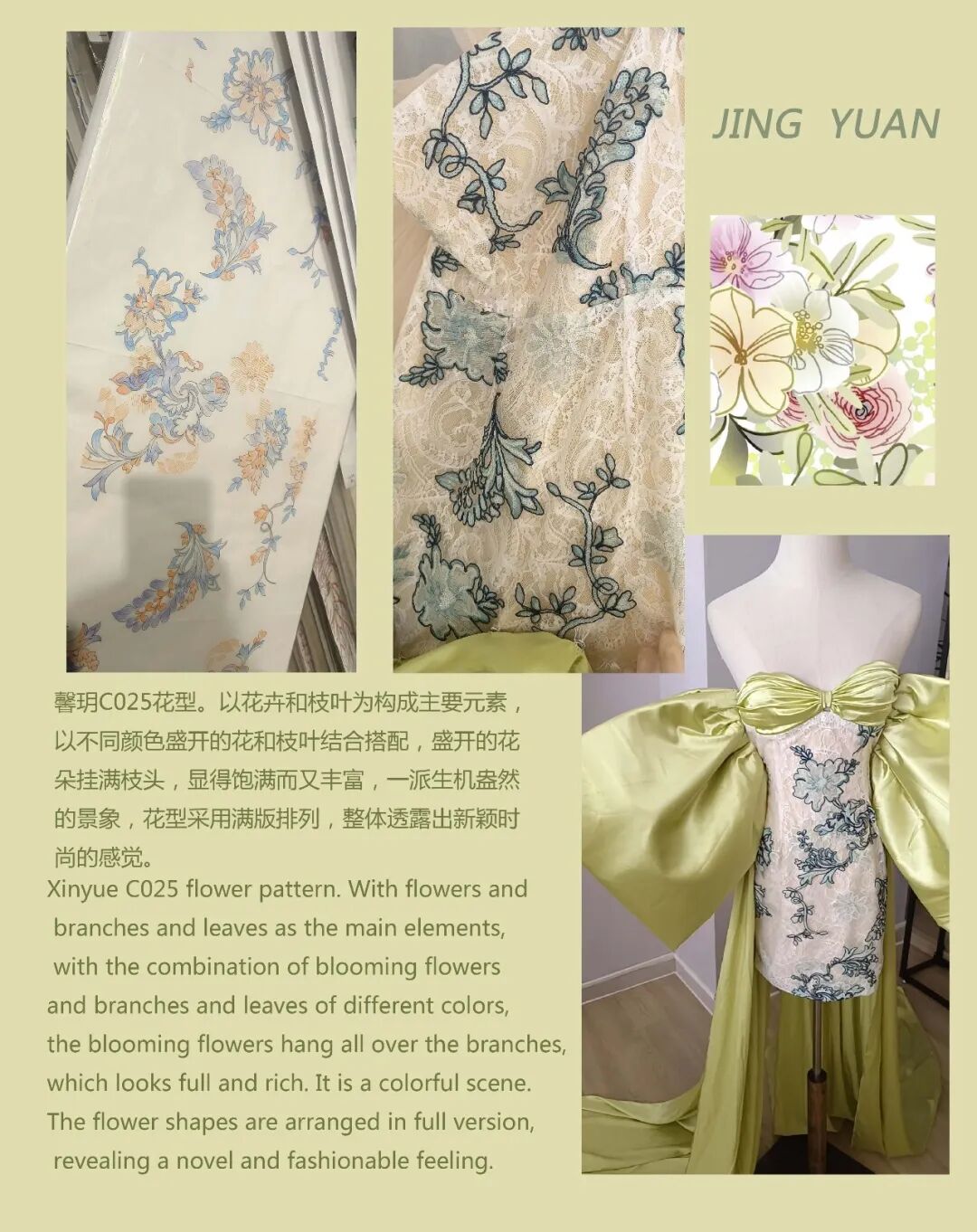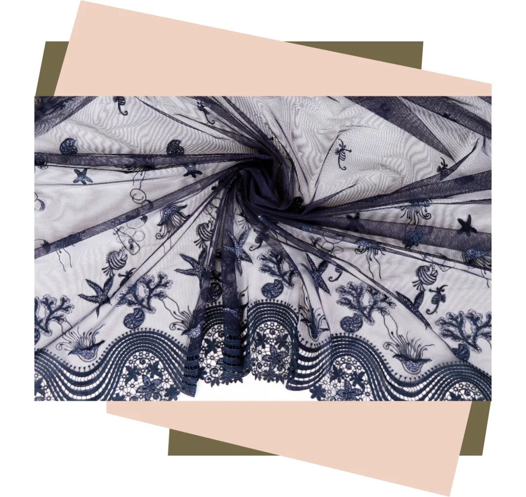 该产品的网底为细腻的细孔网,纱线为低捻纱掀布绣,采用100%聚脂纤维为原料。其整体的花型栩栩如生,水溶部分既立体感强,又手感柔软。设计上,通过蕾丝和镂空的结合,使之飘逸且富有质感,厚薄适中,可用于春秋长裙。而在清洗时,需隔布低温蒸汽烫,温度在80-110度左右,套袋机洗,严防勾丝、爆晒。
