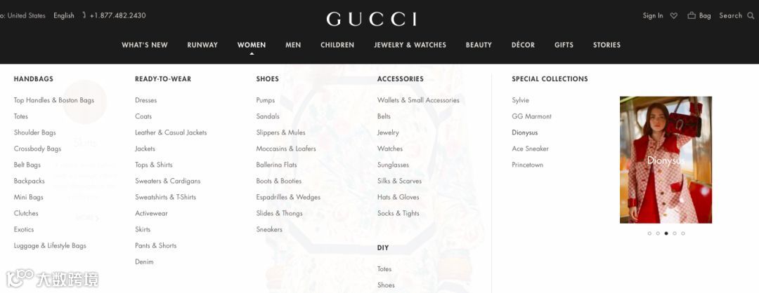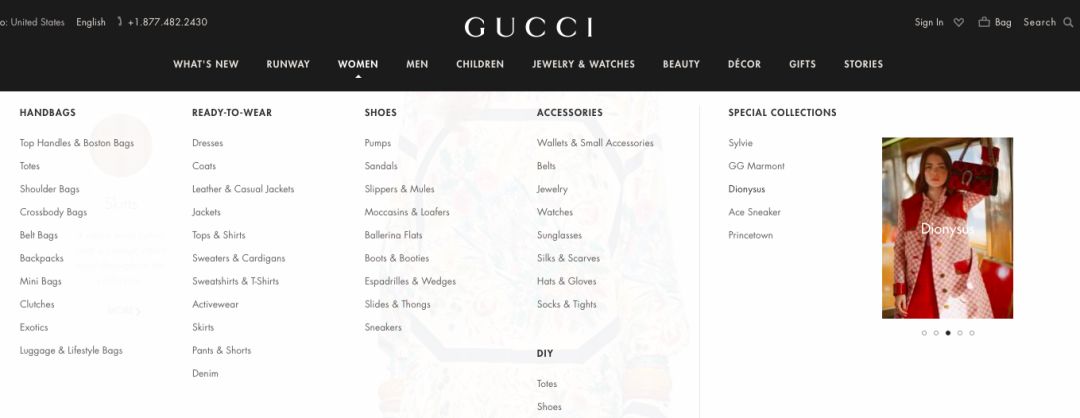 Gucci 网站充满了电商的元素:搜索功能,菜单栏等都跟一般电商网站没有任何区别