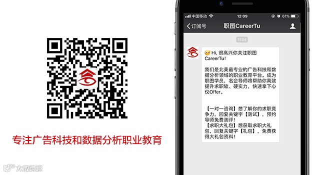 职图CareerTu是中美最专业的广告科技和数据分析的职业教育平台,扫码关注职图公众号,阅读互联网广告科技行业干货内容,体验来自名企导师的免费课程。