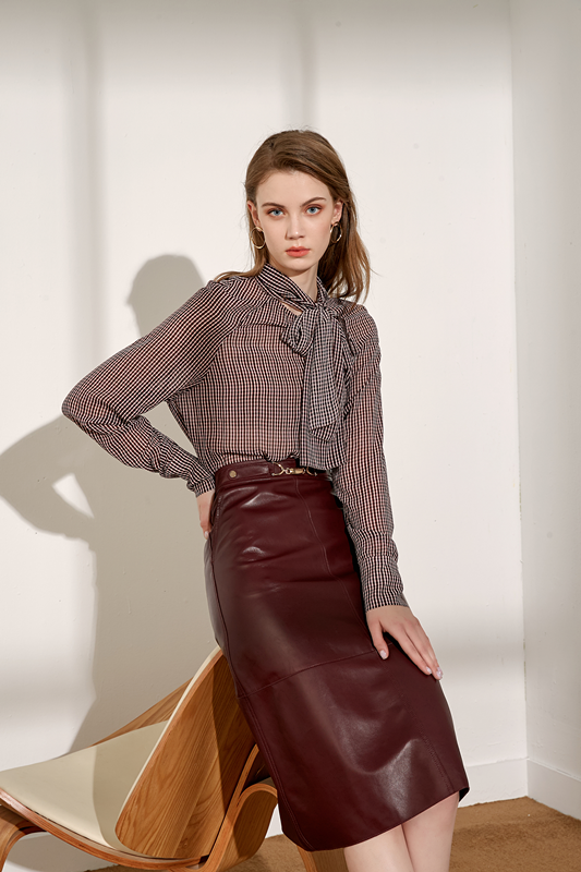 简洁大气的易搭配的直身长裙,进口双面皮的选材,腰部的金属装饰,提升身形的比例。