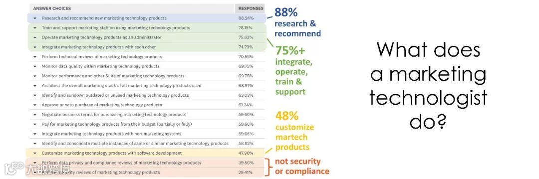 那么,究竟是营销、还是IT出身的人更适合营销技术官的职位呢?他们具体应该做什么呢?Scott组织对全球的营销技术官进行了调查,发现:88%的营销技术官是做研究和咨询;然后接下来的三项工作是培训和支持性的工作,即跨越技术鸿沟,最大程度利用营销技术。也有很大一部分人在做技术的运营,还有一部分人负责系统之间的整合,让系统能够更好的交互。