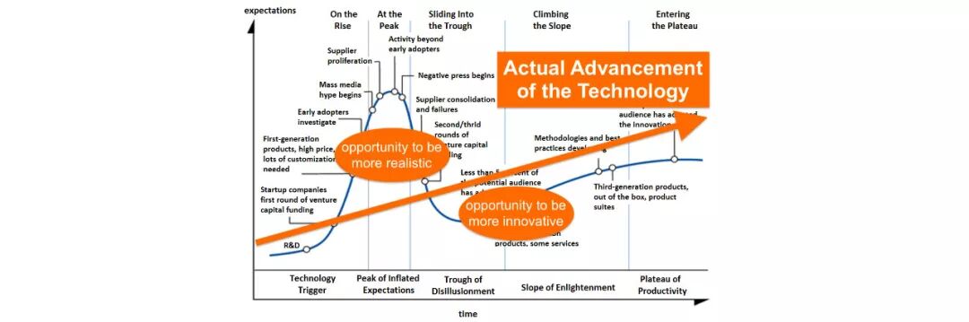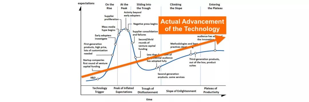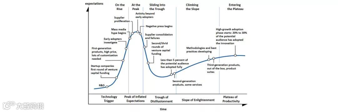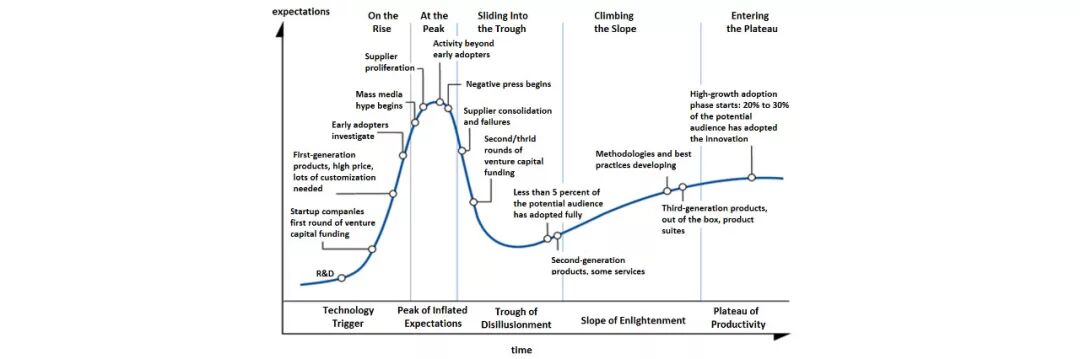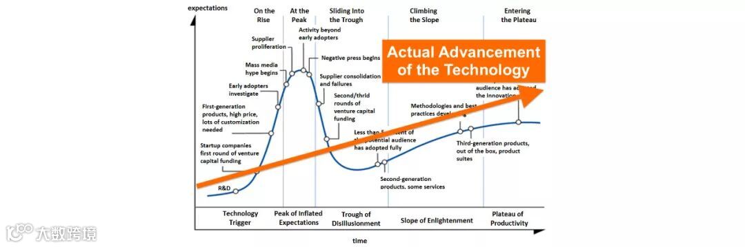 Scott在现场展示了Gartner这家分析公司在20年前做的一张图片,关于各类新科技的成熟演变的程度,从技术诞生的初创期,到期望膨胀的峰值期;比如说大数据的发展,但好像生意并没有因为采用大数据而变得更好,随着这种失望会出现低谷期,认为技术并没有带来实际的利益;随着技术的进一步发展,人们学会如何利用这些新技术,由此产生复苏期,以及第五个阶段,即成熟期。