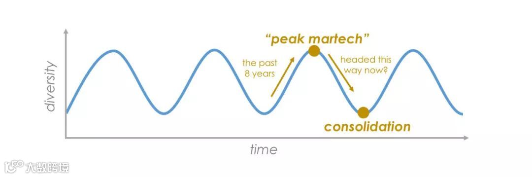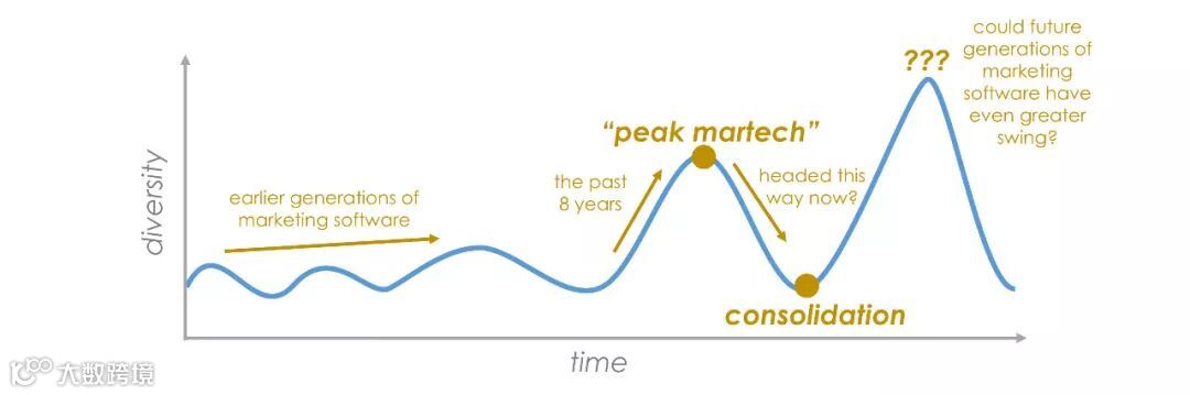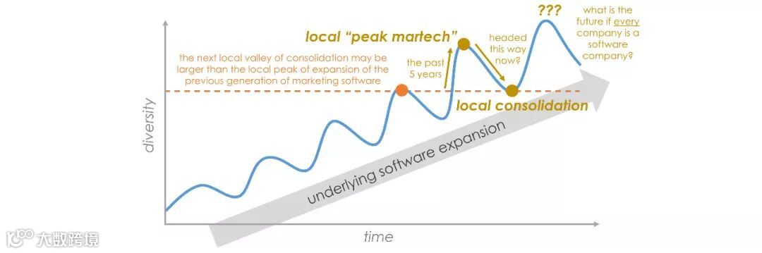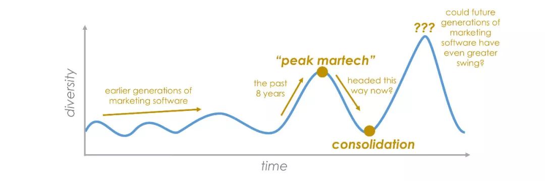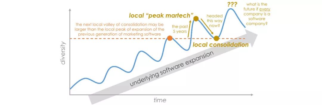 这张图一直在提醒所有营销技术行业的从业人员,我们所处的位置在哪里。即使认为自己达到了营销技术的巅峰,之后就会发生整合和收缩。Scott建议把这张图逆时针方向旋转45度,「因为整体而言,全球软件的数量是一直在增长,所以虽然有这样波浪的发展,但是整体而言是在向上发展。所以,即便我们进行收缩,未来几年营销技术行业会出现整合,整合之后的低点也比之前要更高。」