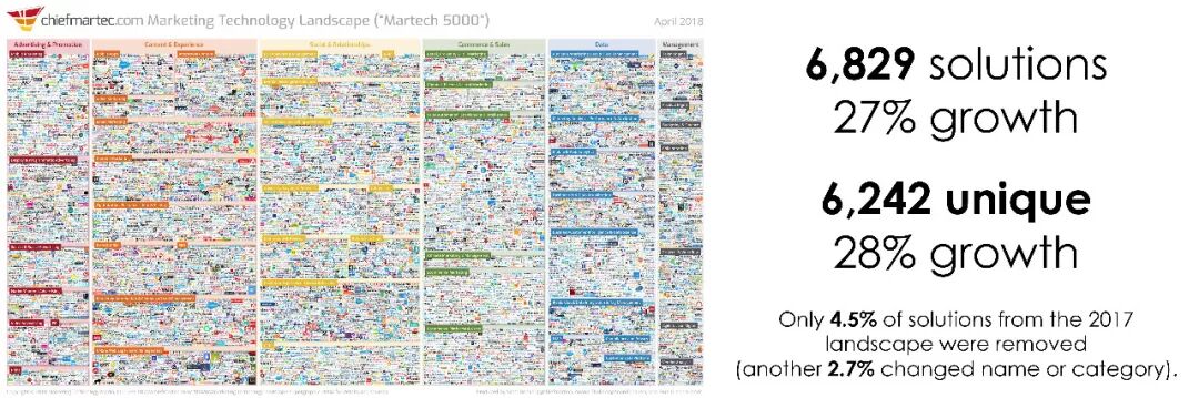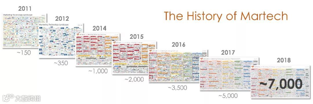 持续增长:这并不奇怪。我们在过去7年中进入市场的营销科技公司数量已经非常庞大,从2011 年的150家营销技术公司,到了2018年,涉及到的企业数量已经到达7000家,营销技术公司旗下的产品或解决方案达到6829项。