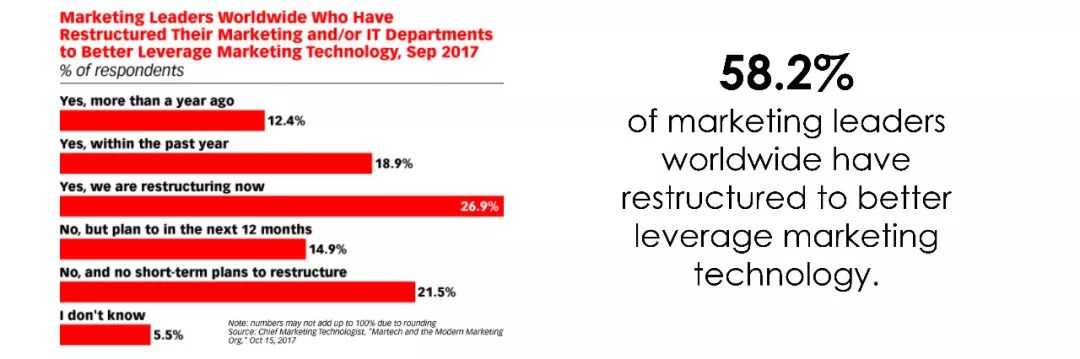 对于营销人员来说,越来越多企业开始重塑营销模式,技术管理能力随之提升,也出现了首席营销技术官的概念(相当于CIO和CMO的整合)。据调查,过去的一年有近60%的营销领导者,已经进行了某种程度的结构改造,来更好的利用营销技术。