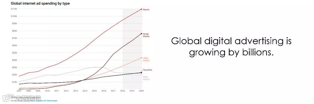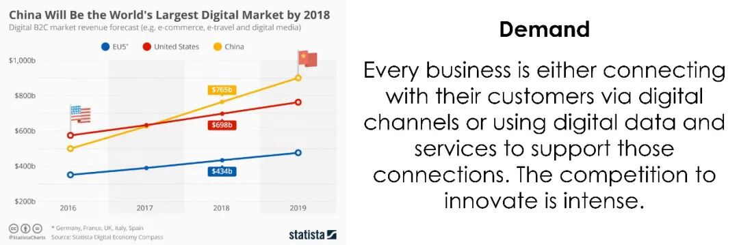 而在需求端,整个世界已经进入数字化时代。消费者对数字化的要求越来越高,品牌也需要通过数字的方式同消费者交流和连接。即便在线下的交流,也会用到数字化技术。全球的数字广告行业是以数十亿美金的速度在增长,中国更是一个非常数字化的市场。