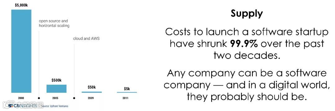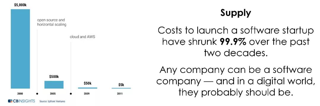 Scott将其归结为供需关系。首先在供应方面,供应成本越来越低。CBInsights曾做过调查:在2000年,需要500万美元的资金才能制作一套软件;而在云技术出现之后,进入软件领域的门槛越来越低,从2009年的5万美元,降至2011年的5000美元。「相信如果有最新的数据,那将会更低。」